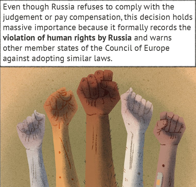 The European Court of Human Rights highlighted the stigmatising nature of the “foreign agent” law and ruled that its use in this case violated the Convention. The shutdown of the organisations was arbitrary and excessive. The Court also noted that forcing the NGOs to attach the “foreign agent” label violated their right to freedom of expression. Therefore, Articles 10 and 11 were violated.